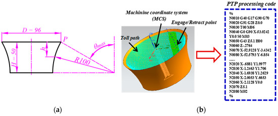 The varying wall angle conical frustum (VWACF) test modal of SPIF. (a) Illustration model of the test (mm). (b) Schematic diagram for the toolpath.