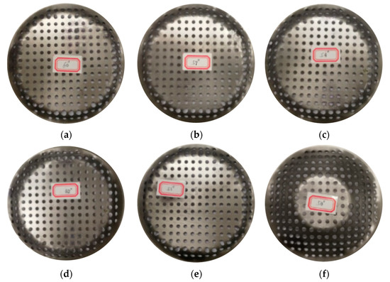 The forming angle is from small to large in the limit experiment of the VWACF model, which means that the forming limit angle that is determined by the above test is not the absolute SPIF forming limit angle. In order to determine the absolute forming limit angle of the SPIF, it is necessary to determine the forming limit angle of the rotating type part. Under the same experimental conditions with the VWACF model, conical frustum incremental forming experiments were carried out, and the experimental results are represented in Figure 6. As can be seen in Figure 6, the test fracture after the maximum forming wall angle is 68.4 degrees in the above test. The wall angle is thus gradually reduced on the basis of 63.5 degrees, and when the wall angle is 50 degrees, the perforated titanium sheet is successfully formed, and the perforated titanium sheets in Figure 7b–f are all ruptured at different depths.
