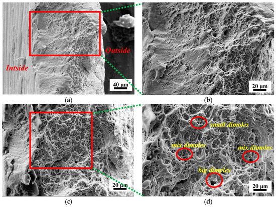 In addition, microvoids were revealed, as seen in Figure 9c,d. When the fracture surface of the same region was magnified ×1000, more micropore-dimples can be observed in the plastic deformation of the perforated titanium sheet microstructure. Dimples are microvoids produced by the plastic deformation of the material within the microregion. The microvoids nucleate, grow, gather, and finally connect to each other, which leads to the effective support area on the material section and continues to decrease before, eventually, the sheet fracture and traces are left on the fracture surface. The fracture surface is clearly divided into two sections. The fracture near the outer surface is a shear-slip fracture with a wavy smooth image, which is related to the accumulation of stress in the surface. The middle layer is a dimple fracture. The initial dimple is small in diameter and shallow in depth, and when near the central area, the size and the depth of the dimple increase slightly. This indicates that the plasticity shows a gradient distribution along the thickness direction. There are a large number of smaller dimples at the inner surface in contact with the tool. The dimple size near the outer surface is large. From the inner surface to the outer surface––that is, the direction where the shear tear occurs––the dimples gradually grow and accumulate. A step-like slip band morphology appeared at the edge of the large dimples, which indicates that relatively higher numbers of plastic deformations were locally produced before the material fractured.