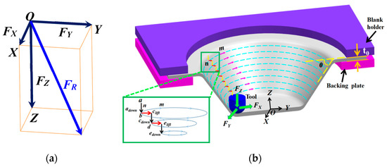 Synthesis of the forming force and the movement route of the tool. (a) Force componenyts in a Cartesian coordinate system. (b) Cross-section view of SPIF process and its parameters. Point (b) and (d) denotes the start point of the tool path in the corresponding layer, once a complete circuit has been made, back to point (b) or (d), the tool lifts to point (clift) or (elift) and then moves down by n direction to point (cdown) or (edown).