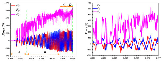 Figure 12 represents the evolution of the three force components by generating a cone with standard process parameters. The tool path used in this part of the analysis follows a continuous trajectory. Since the contact and separation of the tool with the perforated titanium sheet occur continuously, the oscillatory forces are observed. The force trend is mainly attributed to the bending effect. In terms of the FZ variation, most of the whole typical forming force curve could be divided into four distinct regions: A, B, C, and D.