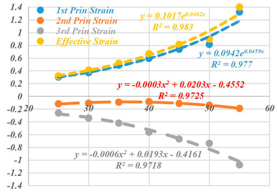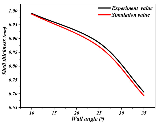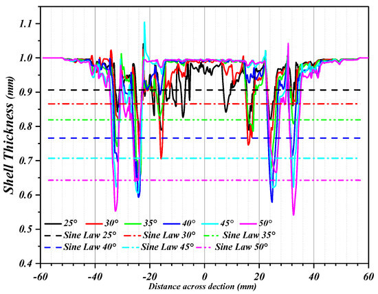 Figure 19 shows the wall thickness of the perforated titanium sheet in different wall angle conditions. Figure 17 shows the thickness contour and theoretical sinusoidal thickness and radial dimension of the perforated titanium sheet at different wall angles along the X axis at the end of forming. The wall thickness of perforated titanium sheet at 25, 30, 35, 40, 45, and 50 degree wall angles estimated by the sine law can be easily calculated to be 0.91 mm, 0.87 mm, 0.82 mm, 0.77 mm, 0.71 mm, and 0.64 mm, respectively. As depicted in the cloud map of Figure 16, it can observe that the distribution zones of the wall thickness were between (0.8937–0.9259) mm, (0.843–0.877) mm, (0.8033–0.8418) mm, (0.7688–0.8195) mm, (0.7479–0.8081) mm, and (0.7202–0.7822) mm, respectively. The relative errors were −1.79 percent to −1.75 percent, −3.1 percent to −0.8 percent, −2.04 percent to −2.66 percent, −0.16 percent to −6.43 percent, −5.34 percent to −13.82 percent and −12.53 percent to −22.22 percent, respectively. As the wall angle increases, the relative error of thickness gradually increased.