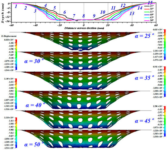The units at and around the hole (the discontinuous region) appear in the inverted-concave form (the normal error h2), while the units away from the hole (continuous region) appear in the outward-convex form (the normal error h1), and both the normal error h2 (concave) and h1 (convex) in the side wall of the perforated titanium sheet gradually decrease with the increase in the wall angle of the perforated titanium sheet. That is to say, with the increase oin the wall angle, the out-of-plane deformation produced by the continuous region of the perforated titanium sheet and the in-plane deformation of the discontinuous region are effectively alleviated. Furthermore, the deformation degree at the tool point (on the left contour of Figure 17) is obviously larger than that of the side wall of the cone table, which is at the same height. Due to this increased deformation, an obvious indentation band is often formed at the tool point.