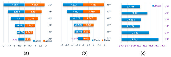 The maximum displacement of the perforated titanium sheet truncated-cone with different wall angles. (a) The maximum X-displacement. (b) The maximum Y-displacement. (c) The maximum Z-displacement.