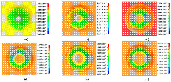 Cloud image of perforated titanium sheet wall thickness with different wall angles. (a) Cloud image of wall thickness at 25 degree. (b) Cloud image of wall thickness at 30 degree. (c) Cloud image of wall thickness at 35 degree. (d) Cloud image of wall thickness at 40 degree. (e) Cloud image of wall thickness at 45 degree. (f) Cloud image of wall thickness at 50 degree.