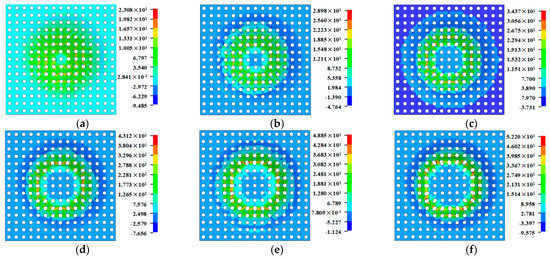 When the wall angle is small, it can be considered that the perforated titanium sheet only occurs during pure stretching, without any obvious through-thickness shear. When the wall angle increases, the total deformation of the perforated titanium sheet consisted of an in-plane stretching and a shear along the thickness direction. As can be observed from Figure 17, in the early stages of the SPIF process, the perforated titanium sheet mainly shifts along the Z-direction. The units at the bottom of the cone undergo a rigid translation, namely, the tool pushes the radial outward material into the cone wall. However, as the SPIF process continues, the radius of the tool contour is smaller, and the material at the bottom of the truncation cone is pushed to the cone wall due to plastic deformation, and a small radial-outward displacement can be seen.
