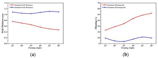 Trend diagram of wall thickness and thinning rate of perforated titanium sheet with wall angle change. (a) Trend diagram of the maximum wall thickness at different wall angles. (b) Trend diagram of the maximum thinning rate at different wall angles.