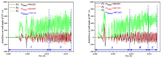 Figure 23 compares the evolution histories of the vertical force vector FZ at the varying of wall angle. When the wall angles varies between 25 degrees and 30 degrees in the SPIF process, due to the insufficient forming depth, the perforated titanium sheet has not formed enough contour, the forming force has not fully entered the stable state, and the forming force fluctuates greatly, which will cause the vibration of the perforated titanium sheet, which affects the accuracy of the manufacturing parts. The results are consistent with the normal errors, which are observed in Figure 17, and the tensile thinning of the material is not significant for the small wall angle. The perforated titanium sheet has experienced a much longer bending process before the strain hardening, which delays the realization of stable conditions.