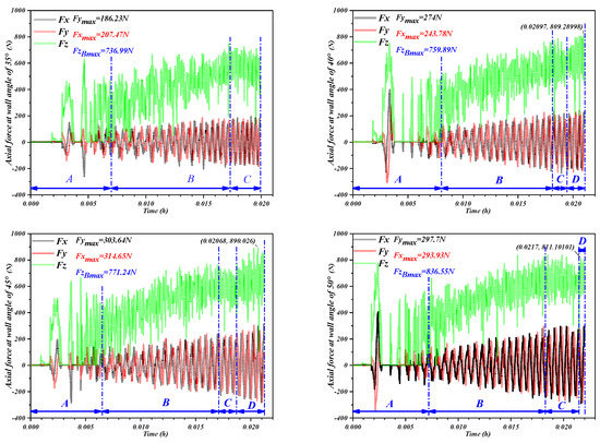The trend of horizontal force and vertical force with the varying wall angle of perforated titanium sheet. (A, B, C and D are the lengths of regions A, B, C and D, respectively).