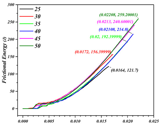 Under the continuous extrusion and friction of the titanium plate and the perforated titanium sheet, the material flows along the circumferential (forming) direction and produces the material accumulation phenomenon. The friction occurs in the upper surface area where the tool and the plate contact, so the friction in the circumferential direction will be more significant than the wall direction and the thickness direction. As is present in Figure 23 and Figure 24, the friction energy increases as the wall angle increases, and the forming forces in the SPIF process are all increased. The friction caused by the circumferential movement of the tool is the largest, the growth rate of the horizontal forming forces (FX and FY) are significantly higher than the axial forming force (FZ).