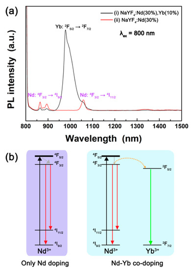 - Pedraza, F.J.; Rightsell, C.; Kumar, G.A.; Giuliani, J.; Monton, C.; Sardar, D.K. Emission enhancement through Nd3+-Yb3+ energy transfer in multifunctional NaGdF4 nanocrystals. Appl. Phys. Lett. 2017, 110, 223107. [Google Scholar] [CrossRef]