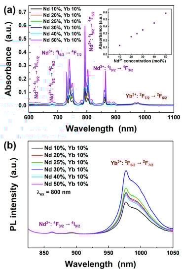 (a) Absorption and (b) PL spectra of NaYF4:Nd (x%),Yb (10%) core DSNPs with various Nd3+ concentrations (x = 10, 20, 25, 30, 40, and 50%) under 800 nm NIR light. Inset shows absorbance values at 794 nm, depending on the Nd3+ concentrations.