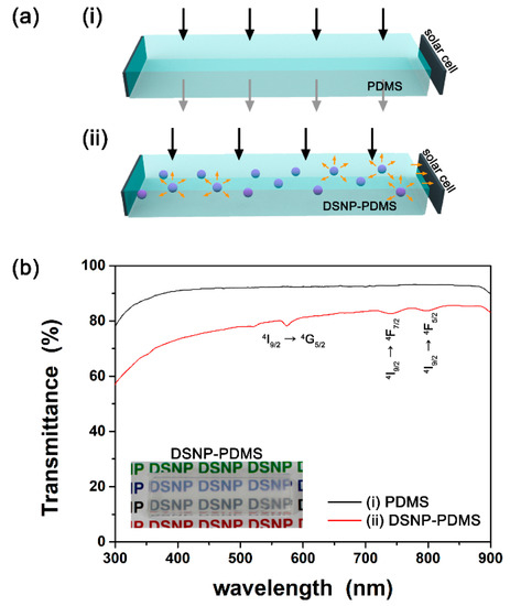 To investigate the feasibility of LSC applications of the NaYF4:Nd (30%), Yb (10%)/NaYF4:Nd (10%)/NaYF4 C/S/S DSNPs, we fabricated NaYF4:Nd (30%),Yb (10%)/NaYF4:Nd (10%)/NaYF4 C/S/S DSNP-PDMS composites. Figure 6a shows a schematic illustration of bare PDMS- and DSNP-PDMS composite-coupled solar cells. In a bare PDMS-coupled solar cell, incident sunlight directly passes through the PDMS polymer so that most sunlight cannot reach the solar cell. In contrast, in the DSNP-PDMS composite-coupled solar cell, NIR photons of incident sunlight are absorbed by the DSNPs, and the DSNPs emit NIR light in all directions. The emitted light is directed to the silicon solar cell attached to the edge of the DSNP-PDMS composite, which can result in electricity generation from the silicon solar cell. Figure 6b shows the transmittance spectra of the bare PDMS and the C/S/S DSNP-PDMS composite. The average transmittance values of the bare PDMS and the C/S/S DSNP-PDMS composite in the visible region (λ = 380–750 nm) were 92.1 and 79.4%, respectively. Although the transmittance of the C/S/S DSNP-PDMS composite was lower than that of the bare PDMS polymer, it was still highly transparent, as shown in the inset of Figure 6b. Therefore, we believe that the C/S/S DSNP-PDMS composite can be applied to transparent PV modules. Additionally, in the transmittance spectrum of the C/S/S DSNP-PDMS composite, peaks were observed at 574, 740, and 794 nm, which were attributed to the light absorption via 4I9/2 → 4G5/2, 4I9/2 → 4F7/2, and 4I9/2 → 4F5/2 transitions of Nd3+ ions in the NaYF4:Nd (30%),Yb (10%)/NaYF4:Nd (10%)/NaYF4 C/S/S DSNPs, indicating the presence of NaYF4:Nd (30%),Yb (10%)/NaYF4:Nd (10%)/NaYF4 C/S/S DSNPs in the PDMS composite [25].