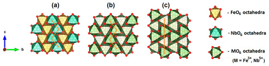 Figure 2 shows the three main polymorphs of the FeNbO4 compound. The monoclinic structure is based on the zig-zag arrangement along the c-axis of FeO6 and NbO6 octahedra. These chains of octahedrons are connected by sharing the corner oxygen atoms along the a- and b-axes. The orthorhombic structure is similar; however, the iron and niobium atoms appear randomly distributed. The tetragonal structure is identical to the orthorhombic structure, yet the arrangement of octahedrons occurs linearly [8,9].