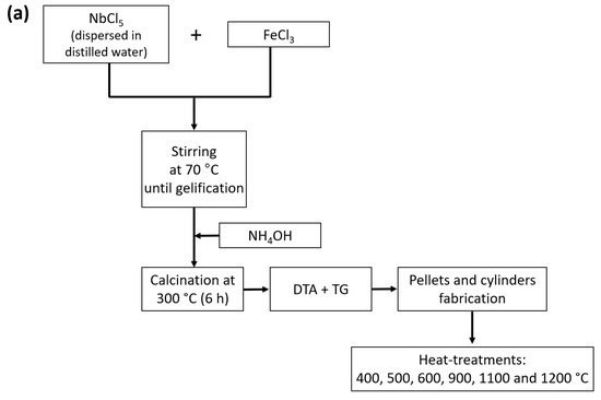 For the colloidal gel method, stoichiometric amounts of the precursors NbCl5 (Merck (Kenilworth, NJ, USA), >98%) and FeCl3 (Riedel-de Haën (Charlotte, NC, USA), >98%) were used. The FeCl3 was added to the NbCl5, which was previously dispersed in deionized water. The mixture was vigorously stirred at 60 °C until a gel was formed. To adjust the pH to 2.4, NH4OH (Alfa Aesar (Haverhill, MA, USA)) was added. The mixture was calcined at 300 °C for 6 h. To establish the heat-treatment temperatures, the obtained powders were subject to thermal measurements, which were carried out with Hitachi STA7300 equipment (Hitachi, Woodland, CA, USA) in a nitrogen atmosphere in a temperature range from room temperature to 1100 °C with a heating rate of 5 °C/min.