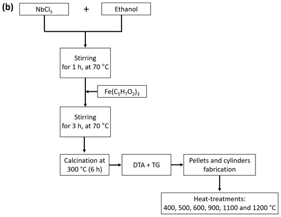 For the polymeric gel method, stoichiometric amounts of the precursors NbCl5 (Merck, >98%) and Fe(C5H7O2)3 (Aldrich (St. Louis, MO, USA), >97%) were used. The NbCl5 was previously dissolved in ethanol and stirred at 70 °C for 1 h. The Fe(C5H7O2)3 was added and the stirring was continued at 70 °C for 3 h, and the obtained mixture was calcined at 300 °C for 6 h. The obtained powder was subject to the same thermal measurements.