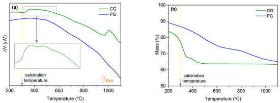 Figure 4b shows depicted the results from the thermogravimetric analysis (TGA), where one can see that in the powders prepared via the colloidal gel method, the weight loss stabilized at 500 °C. In the powders prepared via the polymeric gel method, the weight loss was smoother but extended to at least 1100 °C.