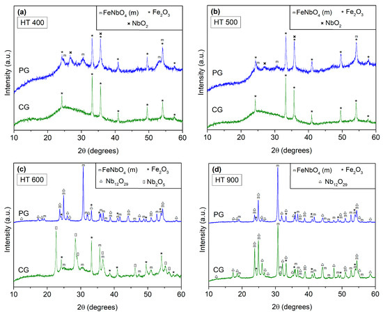 In the heat treatments performed at 400 and 500 °C, Figure 5a and Figure 6b show that regardless of the preparation method, the presence of amorphous material was noticeable. However, in the powders prepared via the PG method, besides the secondary phases Fe2O3 and NbO2, monoclinic FeNbO4 (m-FeNbO4) was identified. With the CG method, the only crystalline phase present was the Fe2O3. In the samples treated at 600 °C with the PG method, besides the phases previously obtained, a new phase, namely, Nb12O29, was formed. In the sample prepared via the CG method, two new phases were formed: the Nb2O5 and the desired monoclinic FeNbO4.