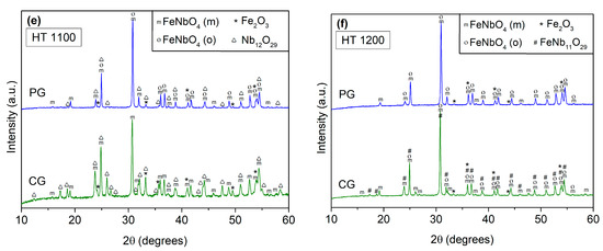 For the PG method, the m-FeNbO4 was already present in the sample that was heat-treated at 400 °C, with the conversion into o-FeNbO4 starting at 1100 °C. For the CG method, the formation of m-FeNbO4 and o-FeNbO4 occurred at 400 °C and 1200 °C, respectively.
