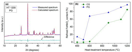 The content of each crystalline phase identified in the prepared samples was estimated via Rietveld’s refinement method using Profex [22]. Figure 6a shows the measured and calculated spectra for the HT 1200 sample prepared via the PG method. Figure 6b presents the evolution of the percentage of the FeNbO4 content with the increase in the heat-treatment temperature. Besides the earlier formation of FeNbO4 with the PG method already mentioned, this graphic also shows that regardless of the treatment temperature, the content of FeNbO4 was always higher in the samples prepared via the PG route.
