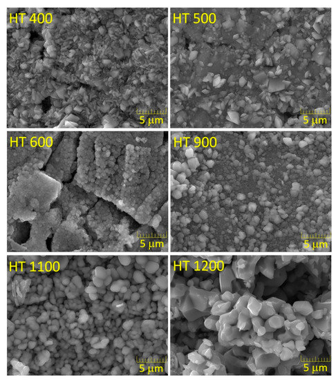 The HT 400 and HT 500 samples were composed of particles with an angular shape and significant heterogeneity in terms of size. The heat treatment at 600 °C promoted a substantial change in the morphology of the material since both the shape and size of the grains were very similar in this sample. This evolution could have been due to the conversion of the amorphous material and the formation of new crystalline phases. With the heat treatment at 900 °C, the grain growth was visible, which is a factor that contributed to the heterogeneity of the sample. With the increase in the treatment temperature, the particles became progressively bigger, with this increase being more pronounced in the HT 1200 sample, possibly due to the decrease in the Fe2O3 content.