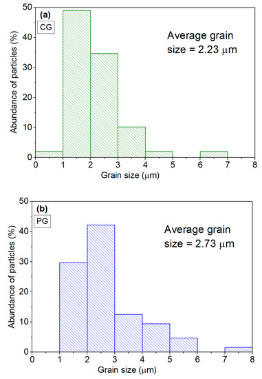 The grain size distributions for the HT 1200 samples prepared via both methods are shown in Figure 9. The data collection was performed using two SEM images to improve the statistical calculation [27]. In the sample prepared via the CG method, the average grain size was 2.23 μm, with only 2% of the analyzed grains being greater than 5 μm. For the sample obtained via the PG method, the average grain size was 2.73 μm, with 6.25% of the analyzed grains being greater than 5 μm.