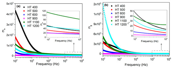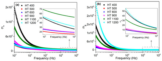 In the low-frequency region, the dielectric constant decreased sharply with the frequency, with the HT 400 sample showing higher values. In the high-frequency region, the ε′ values decreased smoothly, with the HT 1100 sample standing out.
