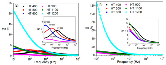 After analyzing the loss tangent for the studied samples, with the results depicted in Figure 12, it was possible to conclude that the HT 400, HT 500 and HT 600 samples prepared via the CG method had a relaxation phenomenon at room temperature in the frequency range used. The increase in the treatment temperature was followed by a decrease in the frequency of the peak, which means that the increase in the treatment temperature culminated in an increase in the relaxation time.