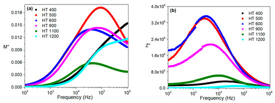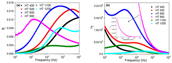 Regarding the modulus formalism, for the CG method (Figure 13a), one can infer that the HT 400 sample had a relaxation mechanism, with the peak maximum occurring at a frequency higher than 1 MHz. The remaining samples had relaxation phenomena that were clearly visible in the analyzed frequency range. With the impedance formalism (Figure 13b), the relaxation mechanism of the HT 900 sample was not visible.
