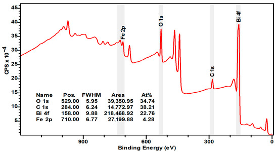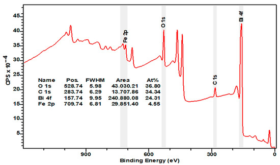 XPS spectra revealed strong presence of heavy elements such as bismuth and Iron and has been shown to play a crucial role in bismuth ferrite magnetic and ferroelectric properties. The presence of these materials gives rise to the spin–orbit interaction of the bismuth ferrite material.