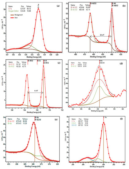 Figure 7. XPS spectra of individual elements (a) O 1s; (b) Bi 4d; (c) Bi 4f; (d) Bi 4s; (e) Bi 4p; (f) C 1s; (g) Fe 2p.