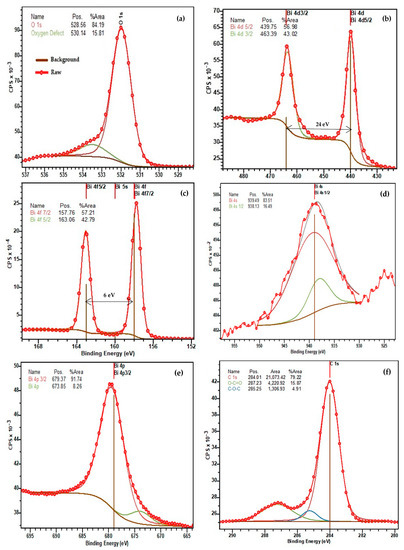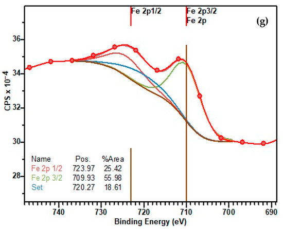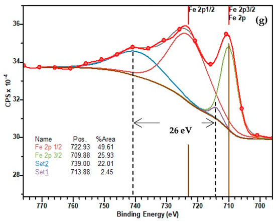 Besides C, Bi, and O elements, the XPS spectrum also indicates presence of pure Fe and Fe3+ content at 709–727 eV on the surface, which could be potentially be related to the parasitic compound of Fe3O4 oxide [23]. Fe 2p 3/2 and Fe 2p 1/2 [24] both correspond with Fe 2+ and can be observed on the spectrum (Figure 6g and Figure 7g) [25]. The satellite peaks were observed on both spectra (Figure 6g and Figure 7g). Nevertheless, the secondary satellite peak was absorbed only on one spectrum (Figure 7g). The energy difference between satellite peaks is around 26 eV. The Fe 2p spectra suggest a high degree of symmetry, but they are still asymmetric, likely due to the formation of oxygen vacancies. Changes in chemical valency of Fe+3 to Fe+2 [26] is because of these vacancies. The presence of satellite peaks is associated with Fe+3 [27], which are represented in the form of an oxide. The location of satellite peaks can be seen on both spectra. A high degree of symmetry of both peaks of Fe+2 is given by a small amount of the formation of oxygen vacancies [28]. Both the high content of Fe+3 and the low presence of oxygen vacancies would have a dramatic effect on overall magnetic properties of the overall cell unit therefore enhancing them. Energy peaks are shifted towards carbon compounds. There is little difference between the two samples, considering the presence of a Pt monolayer, which will prevent any potential diffusion into BFO layer. In addition to the Pt monolayer, titanium oxide and titanium will provide an outstanding integration of Pt and other monolayers including the Si substrate.