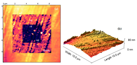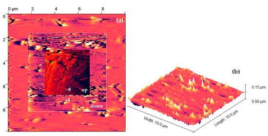 The PFM measurements have been performed on NTEGRA Prima from company NT-MDT. FMG01/Pt sharp probe was used in order to perform PFM measurement. The surface of the produced samples was analyzed by using Piezoresponse Force Microscopy. The Figure 8, Figure 9, Figure 10 and Figure 11 indicate the surface of the analyzed sample 100 nm BFO (Pt/Ti(TiO2)/Si) samples, where the size of the investigated area of samples is (10 × 10) µm2. The measurement has been performed with a scanning frequency of 0.25 Hz to obtain current distribution and phase images (Figure 9 and Figure 11). The samples underwent PFM analysis under +8, −8, 0 voltage bias in order to determine the switching mechanism of the magnetic domains in the prepared samples (Figure 9 and Figure 11). In addition to the topography images, images of local current distribution and phase alignment are provided. A current image represents the distribution of the piezoelectric current generated in response to the AC voltage modulation, which is proportional to the local piezoelectric officiant of the deposited material (Figure 9 and Figure 11). Phase image represents the phase difference between the AC voltage applied to a sharp tip. The magnitude and polarity of the piezoelectric current are proportional to the piezoelectric coefficient and the direction of polarization of the sample. Both current image and phase image provide the mapping of the domain structure of the bismuth ferrite thin films, which reveal the orientation and distribution of piezoelectric active domains. A Gaussian filtering function was used to create more visible and pronounced piezo-active regions and magnetic patterns.