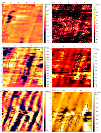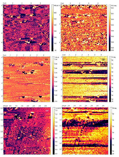 The PFM investigation of the second sample did not reveal a 71° switching mechanism. Nevertheless, the coloration of the investigated regions exhibits different contrasts under various applied voltage biases, which confirms the piezoelectric activities of investigated samples with correlation to the current distribution images (Figure 11a, c, e). The phase images of domain orientation reveal that the magnetic domains did not exhibit a uniform, well-defined, striped alignment of domain moments (Figure 11b, d, f). However, according to the phase images, the magnetic domains seem to organize into straight lines, which would suggest the creation of local but weak stripe patterns. Therefore, we speculate that there could be some issue related to the scanning probe of PFM, and that potential damage could have been sustained during previous scanning.
