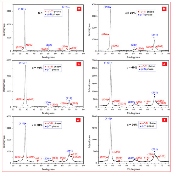 XRD patterns of the Ti29Nb-9Ta-10Zr alloy corresponding to following stages: (a) initial state—S-1; (b) MPR processed with ε = 20%; (c) MPR processed with ε = 40%; (d) MPR processed with ε = 60%; (e) MPR processed with ε = 80%; (f) MPR processed with ε = 90%.
