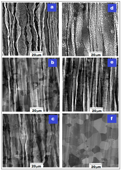 SEM images of the Ti29Nb-9Ta-10Zr alloy corresponding to the following stages: (a) initial state—S-1; (b) MPR processed with ε = 20%; (c) MPR processed with ε = 40%; (d) MPR processed with ε = 60%; (e) MPR processed with ε = 80%; (f) MPR processed with ε = 90%.