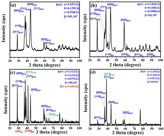 Figure 2 presents the diffraction patterns of diffractograms of Cu15HZ25 and Cu15HZ30 both in as-cast and as-homogenized states, as depicted in Figure 2a, b, respectively. These patterns indicate that the B19′ martensite is the primary constituent of both alloys at room temperature in the as-cast state. In Cu15HZ30, the lattice constants of B19′ were found to be = 3.146 (Å), = 4.129 (Å), = 4.931 (Å), and = , with a calculated volume of 62.749 () by . Although a small amount of B2 austenite was observed in Cu15HZ30, B19′ martensite remained the dominant structure. Similarly, the lattice constants of Cu15HZ25′s B19′ were = 3.107 (Å), = 4.135 (Å), = 4.910 (Å), and = , with a calculated volume of 61.856 () for B19′ unit cells. After homogenization, both HCu15HZ25 and HCu15HZ30 still consisted mainly of B19′ martensite at room temperatu re, as shown in Figure 2. The lattice structure of HCu15HZ25 was found to be monoclinic with a P21/m space group, and the lattice constants of B19′ were determined to be = 3.112 (Å), = 4.132 (Å), = 4.875 (Å), and = . In HCu15HZ25, a small amount of B2 austenite coexisted with B19′ martensite at room temperature. The B2 austenite was found to belong to BCC structures, with a lattice constant of a = 3.107 (Å). The lattice structure of HCu15HZ30 was the same as that of HCu15HZ25, with lattice constants of B19′ being a = 3.145 (Å), b = 4.164 (Å), c = 4.927 (Å), and = 100.81. After homogenization, Ti2Ni-like peaks were also observed in both alloys, and were consistent with the results of the microstructure and EDS analyses.