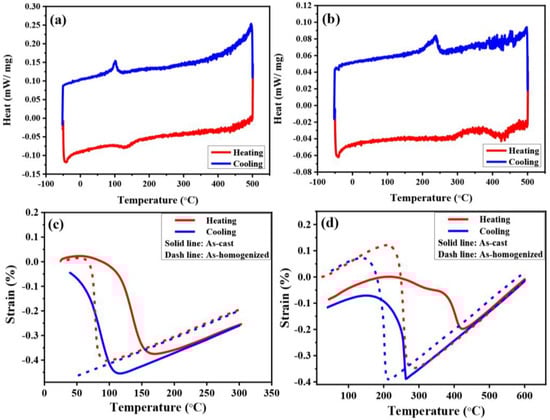 Thermal analysis of as-cast and as-homogenized states. (a) Cu15HZ25 and (b) Cu15HZ30, analyzed by DSC; (c) Cu15HZ25 and (d) Cu15HZ30, analyzed by DIL.