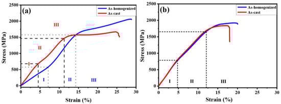 Compressive stress–strain curves of (a) Cu15HZ25 and (b) Cu15HZ30 in as-cast and as-homogenized states.