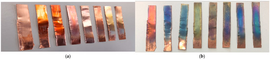 Copper strips directly after oxidative low-pressure plasma treatment (a) and after three days (b) with pronounced interference effects of the oxidized layers. Picture (a) shows the reddish discoloration, which appeared immediately after the ambient air plasma treatment. After one week, different colors appeared, caused by interference effects of copper oxide layers with different thicknesses, as can be seen in photo (b).