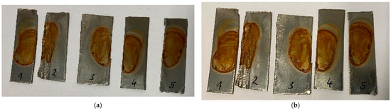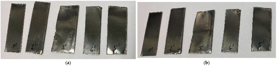 Steel strips before (a) and one week after oxidative low-pressure plasma treatment (b). The samples on the right-hand picture were treated for 12 (1′), 24 (2′), 36 (3′), 48 (4′), and 60 (5′) min. No plasma effect was visible on the steel strips.