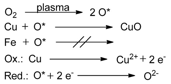 A suggested redox equation system can be seen in Figure 3. The plasma affects primarily the process gas, which was in this case ambient air. One essential component for oxidation attempts of this air is oxygen. The effect of plasma is the dissociation of molecular oxygen to its atomic form. Another plasma effect is the excitation of oxygen to higher energetic levels, leading to a more reactive oxygen species. Oxidation success is visible in the case of copper (Figure 1). On the copper strips, an oxidized layer of copper oxide, where copper has the oxidation state of +2, became visible through the interference effects. Copper had therefore lost two electrons, which were taken by oxygen (see Figure 3). As a result, copper was oxidized and oxygen was reduced.