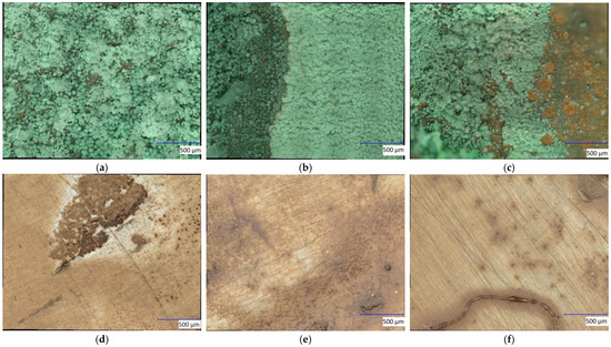 Microscope images of the copper (a–c) and iron patinas (d–f) before plasma treatment (a,d) and after 30 min (b,e) and 60 min (c,f) of Varigon plasma at low-pressure. This plasma influence led to a darker discoloration of the copper nitrate patina over the treatment times. The iron acetate patina showed less significant alterations with increasing treatment time. Only a slight grayish color change in the patina can be seen.