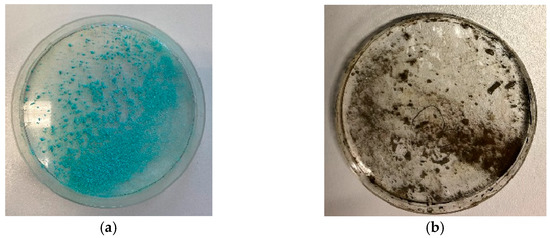 As can be seen in Figure 7, Figure 8 and Figure 9, the low-pressure Varigon plasma treatment has a recognizable effect on all three salts under investigation. In the case of CuCl2, an intensive darkening of the salt to a very dark yellowish-brown, almost appearing black (Figure 7), occurred after 30 min. The plasma treatment of FeSO4 did not lead to a darkening of the salt crystals but rather to a significant change in color. After 30 min of plasma treatment, the green crystals had turned a light, almost silvery, metallic gray (Figure 8). No drastic color change occurred with the Varigon treatment of FeCl3. Only the yellow-red changed to a more reddish color. However, a deliquescence of the crystals occurred, and a crystalline liquid was formed (Figure 9).