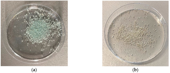 FeSO4 · 7 H2O crystals before (a) and after 30 min reductive Varigon low-pressure treatment (b). The plasma-induced color change from a pale turquoise to an almost silver gray can be seen by comparing pictures (a,b).