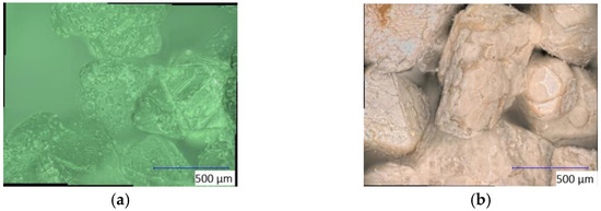 Under a microscope, clear changes were observed in the salts CuCl2 and FeSO4. After a treatment time of one hour, a transition from initially turquoise green to a reddish-brownish yellow and then further to a dark gray could be observed for CuCl2 (Figure 10). FeSO4 exhibited a similar color progression. Here, the initially greenish salt changed to a gray color within one hour, which resulted in a significantly lighter gray tone (Figure 11) than with CuCl2. Furthermore, it was noticed during the preparation of the microscope images that yellowish areas had developed from the light-gray surface shortly after the plasma treatment. These areas grew in size after treatment with time until the whole salt had taken on this light-yellow hue after about 8 h. Due to the liquefaction of the FeCl3 crystals after treatment, no significant images of these samples were possible to obtaindirectly after the plasma reduction experiments, as only a detachment of the crystals from the solid compound into the formed liquid phase could be observed.