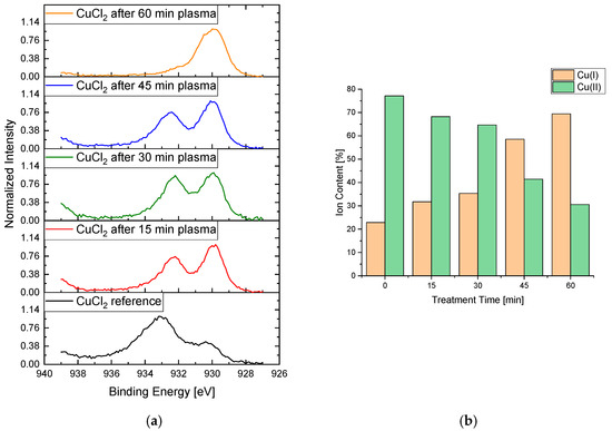Plot of the respective Cu-2p3 signal (a) of copper(II) chloride after 15 (red), 30 (green), 45 (blue), and 60 min (orange) treatment time at a low pressure with Varigon plasma compared to the reference (black). The stacking of these graphs clarifies the decrease in the left Cu2+ signal and the increase in the Cu+ signal with higher treatment times. The right picture shows a plot of the conversion of Cu2+ to Cu+ (b) at different treatment times, which illustrates a time-dependent reduction trend.