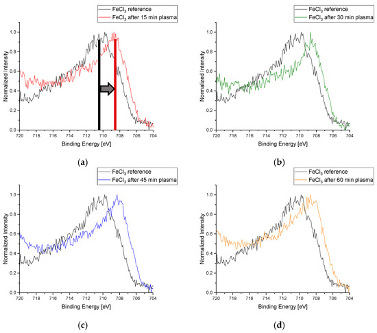 Plot of the respective Fe-2p3 signal of iron(III) chloride after 15 (a), 30 (b), 45 (c), and 60 min (d) treatment time at a low pressure with Varigon plasma compared to the reference (black signals in the plots). The clearly visible shift of the plasma-treated samples from the reference sample to lower binding energies proves the plasma-reduction effect on FeCl3 layers. The color columns in picture (a) visualize the peak positions before (black column) and after plasma treatment (red column) to illustrate the peak shift (arrow).