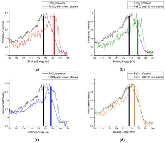 Plot of the respective Fe-2p3 signal of iron(II) sulfate after 15 (a), 30 (b), 45 (c), and 60 min (d) treatment time at low pressure with Varigon plasma compared with the reference (black signals in the plots). Similar to the FeCl3 samples, a successful reduction can be seen in these spectra by the shift of the plasma-treated samples to lower binding energies. It is noticeable that the shift consistently decreases with a higher treatment duration. The color columns in the pictures visualize the peak shift after plasma treatment compared to the reference (black column).