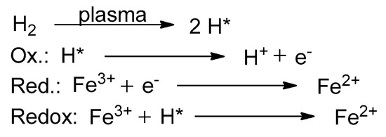 Redox equations of the elemental processes during the plasma reduction of the iron salt layers with the specific oxidation and reduction equations in the second and third line. The first line shows the plasma-induced dissociation of molecular hydrogen to excited atomic hydrogen (H*) and the last stands for the complete redox process.
